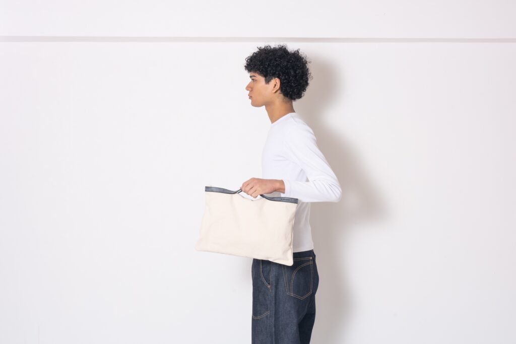 本体には帆布素材の中でも最も汎用性の高い中肉キャンバスをベースにパラフィン含侵によりハリコシを与え、さらにウォッシュ加工を行い、使い込んだ雰囲気が残ったビンテージ感のある素材を使用。持ち手部分のレザーはベジタブルタンニンレザーを使用しており、使い込むことで手の油脂が革の銀面にしみこむことで美しい光沢が生まれます。じっくり長い年月をかけて育っていく楽しみを与えてくれるレザーとなっています。裏地には綿ライクな仕上がりのシワナイロンはタスラン加工糸を使用しているため、柔らかい風合いとナチュラルな素材を使用。