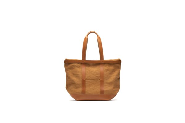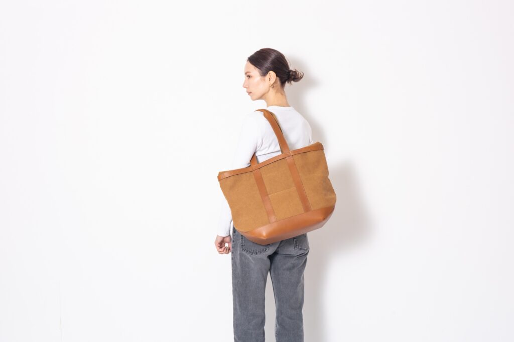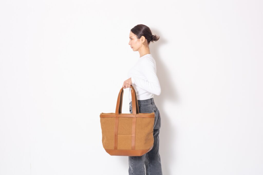お出かけGO TOシリーズ。本体には繊維の街 倉敷/児島で長年、使い続けられてきた「シャットル織機」により太番手のヨコ糸を高密度に打ち込むことで、非常にの高いボリュームを出し、さらにVTバイオ加工を施すことでヨコ糸のジュートが麻特有の自然な粗野感とソフトな風合いを生み、アンティークな質感を楽しめる素材。ヨコ糸に使用しているジュートは、高温多湿の気候で栽培された植物の茎の皮を加工したもの。ジュートの特徴としては、伸縮度が小さく安定している点以外にも、農薬や肥料をほとんど使用せず栽培され、生分解性の高いことから環境負荷が少ない素材です。底と持ち手は分厚いコンビなめしレザーを採用。しなやかで使う度、風合いが増していきます。こちらはLサイズになります。