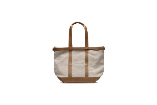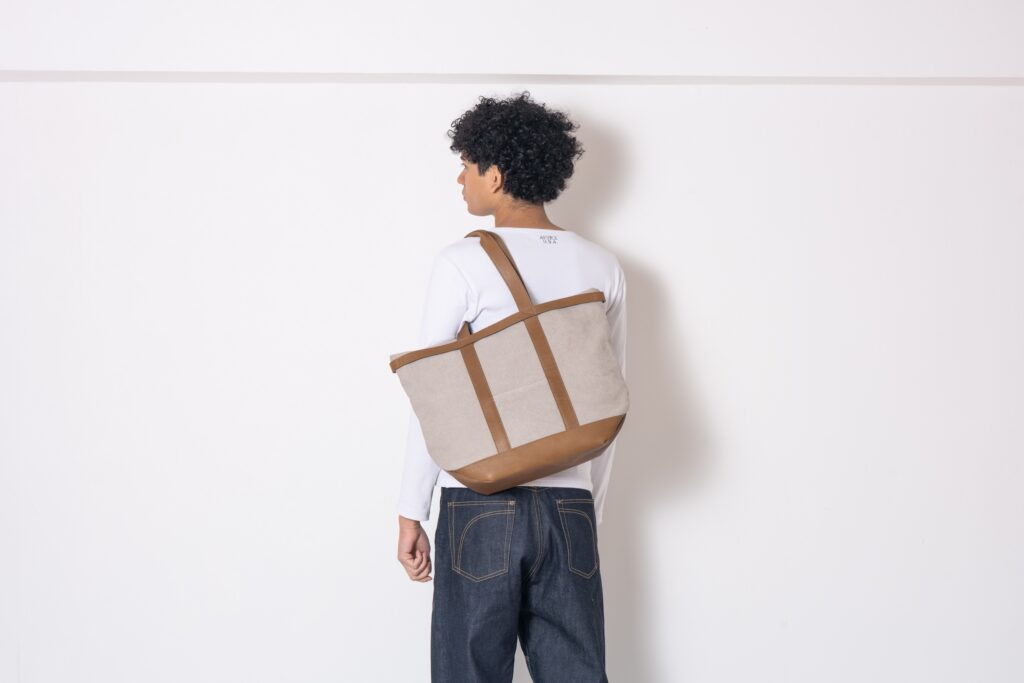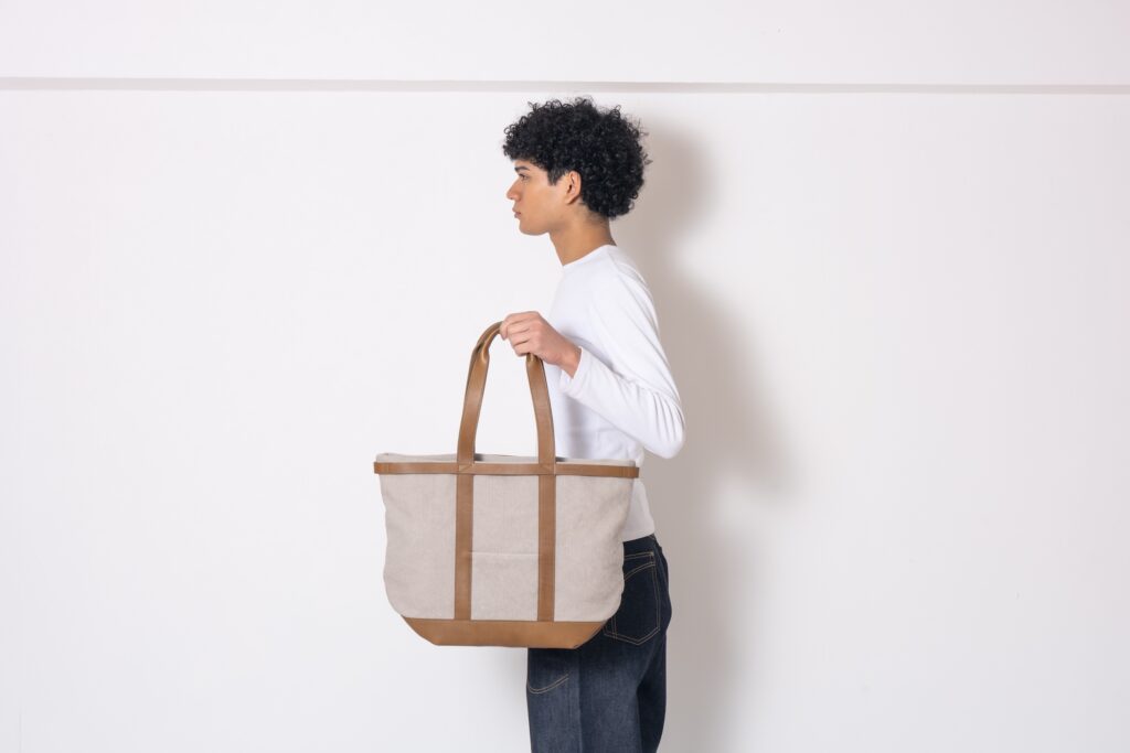 お出かけGO TOシリーズ。本体には繊維の街 倉敷/児島で長年、使い続けられてきた「シャットル織機」により太番手のヨコ糸を高密度に打ち込むことで、非常にの高いボリュームを出し、さらにVTバイオ加工を施すことでヨコ糸のジュートが麻特有の自然な粗野感とソフトな風合いを生み、アンティークな質感を楽しめる素材。ヨコ糸に使用しているジュートは、高温多湿の気候で栽培された植物の茎の皮を加工したもの。ジュートの特徴としては、伸縮度が小さく安定している点以外にも、農薬や肥料をほとんど使用せず栽培され、生分解性の高いことから環境負荷が少ない素材です。底と持ち手は分厚いコンビなめしレザーを採用。しなやかで使う度、風合いが増していきます。こちらはLサイズになります。