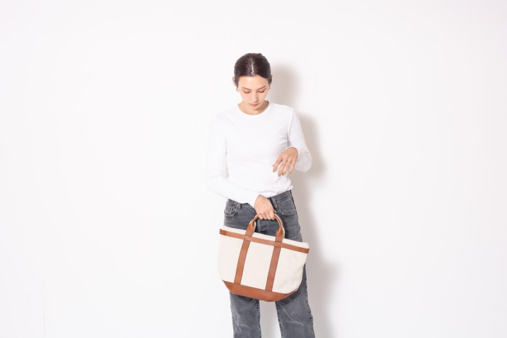 お出かけGO TOシリーズ。本体には繊維の街 倉敷/児島で長年、使い続けられてきた「シャットル織機」により太番手のヨコ糸を高密度に打ち込むことで、非常にの高いボリュームを出し、さらにVTバイオ加工を施すことでヨコ糸のジュートが麻特有の自然な粗野感とソフトな風合いを生み、アンティークな質感を楽しめる素材。ヨコ糸に使用しているジュートは、高温多湿の気候で栽培された植物の茎の皮を加工したもの。ジュートの特徴としては、伸縮度が小さく安定している点以外にも、農薬や肥料をほとんど使用せず栽培され、生分解性の高いことから環境負荷が少ない素材です。底と持ち手は分厚いコンビなめしレザーを採用。しなやかで使う度、風合いが増していきます。こちらはMサイズになります。