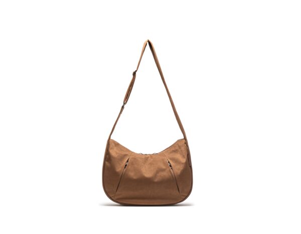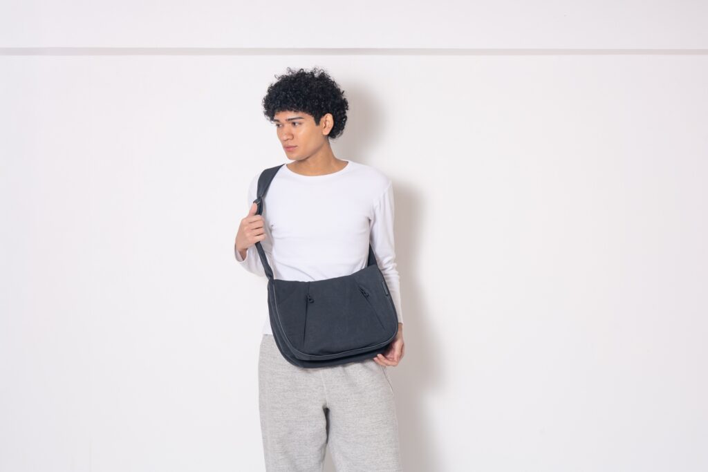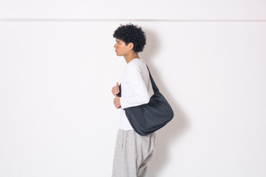 「モーフィングさせる」をテーマに完成させた「MORPH」シリーズ。 使い方でバッグのシルエットを変化させます。FRONT FACEとBACK FACEのどちら側でも表側として使用できるデザインにしました。片面はファスナー付きポケットデザイン、片面はプレーンでシンプルなデザインにしております。スタイリングによって使い方を変えて使用できます。 本体生地は特殊な糸使いと加工の組み合わせで極限まで密度を上げて仕上げをしており、撥水性を高めたスエードのような風合いとタッチが魅力の超高密度Mil Clothです。イタリア陸軍で正式装備に採用されたこともあるタフな素材を使用。肉厚でしなやかな生地にフルベジタブルレザーをコンビネーションして完成させた高級感漂うショルダーバッグとなっています。また、ショルダーから1枚パーツで流れるマチを大きく設計することで、収納力に加えて、荷物の入り方次第でさらにシルエットも変えられる楽しさもあります。 こちらのサイズはMサイズになります。