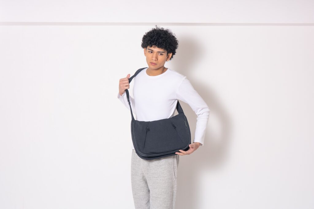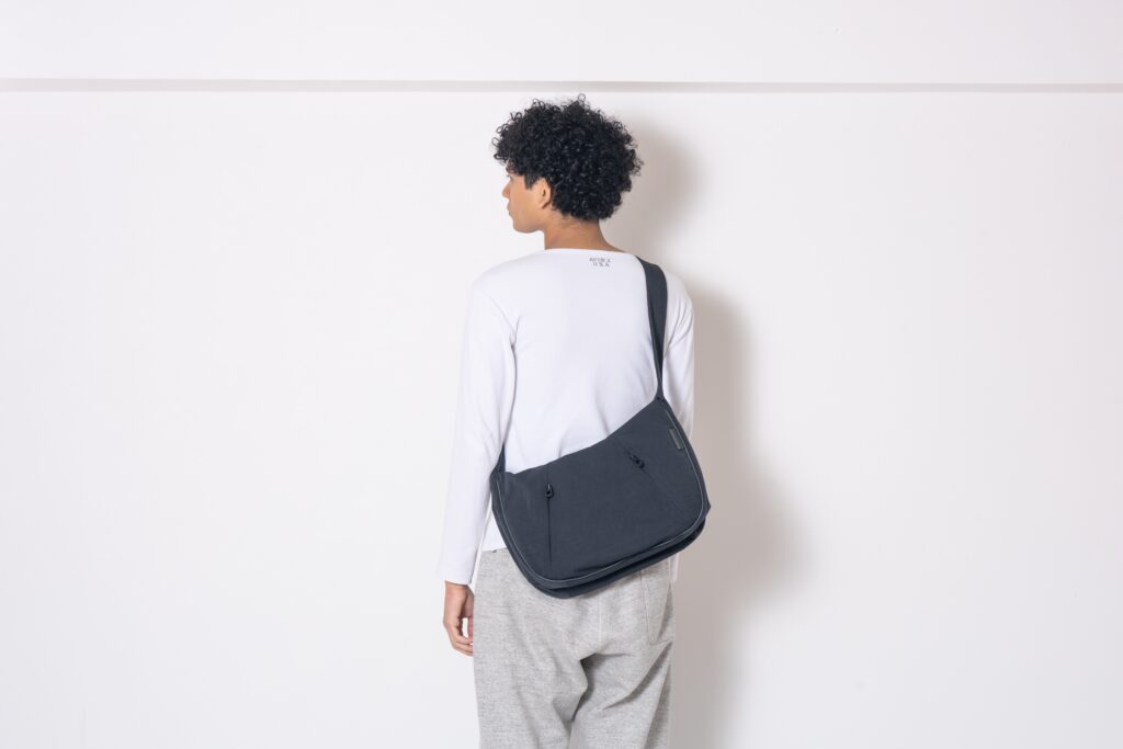 「モーフィングさせる」をテーマに完成させた「MORPH」シリーズ。 使い方でバッグのシルエットを変化させます。FRONT FACEとBACK FACEのどちら側でも表側として使用できるデザインにしました。片面はファスナー付きポケットデザイン、片面はプレーンでシンプルなデザインにしております。スタイリングによって使い方を変えて使用できます。 本体生地は特殊な糸使いと加工の組み合わせで極限まで密度を上げて仕上げをしており、撥水性を高めたスエードのような風合いとタッチが魅力の超高密度Mil Clothです。イタリア陸軍で正式装備に採用されたこともあるタフな素材を使用。肉厚でしなやかな生地にフルベジタブルレザーをコンビネーションして完成させた高級感漂うショルダーバッグとなっています。また、ショルダーから1枚パーツで流れるマチを大きく設計することで、収納力に加えて、荷物の入り方次第でさらにシルエットも変えられる楽しさもあります。 こちらのサイズはMサイズになります。
