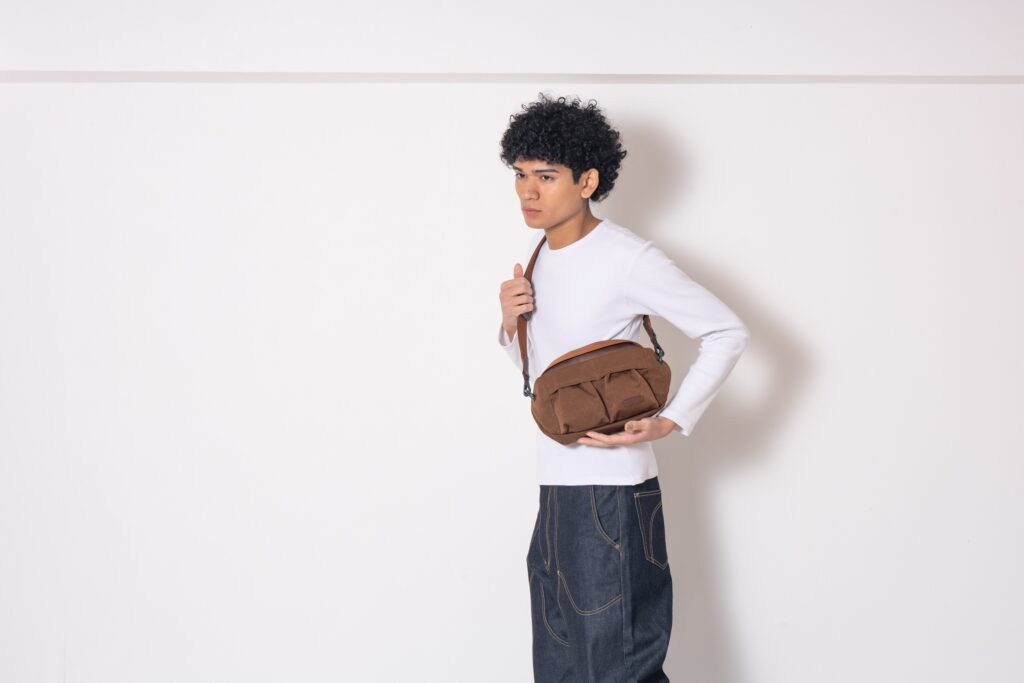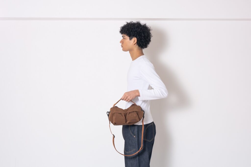 「モーフィングさせる」をテーマに完成させた「MORPH」シリーズ。 使い方でバッグのシルエットを変化させます。両サイドのリングカラビナをハトメ1つ取り外して使用することでマチを解放させ、小さな見た目以上の収納力を発揮させます。 また、ショルダーを取り外して、本体に付いた持ち手を持って持ち運ぶ事ができる構造にしています。 本体生地は特殊な糸使いと加工の組み合わせで極限まで密度を上げて仕上げをしており、撥水性を高めたスエードのような風合いとタッチが魅力の超高密度Mil Clothです。イタリア陸軍で正式装備に採用されたこともあるタフな素材を使用。肉厚でしなやかな生地にフルベジタブルレザーをコンビネーションして完成させた高級感漂うボディバッグとなっています。 メインバッグ、サブバッグとしても毎日使っていただけるとても機能的なボディバッグとなっております。