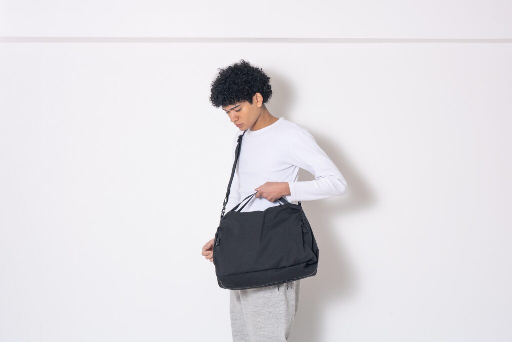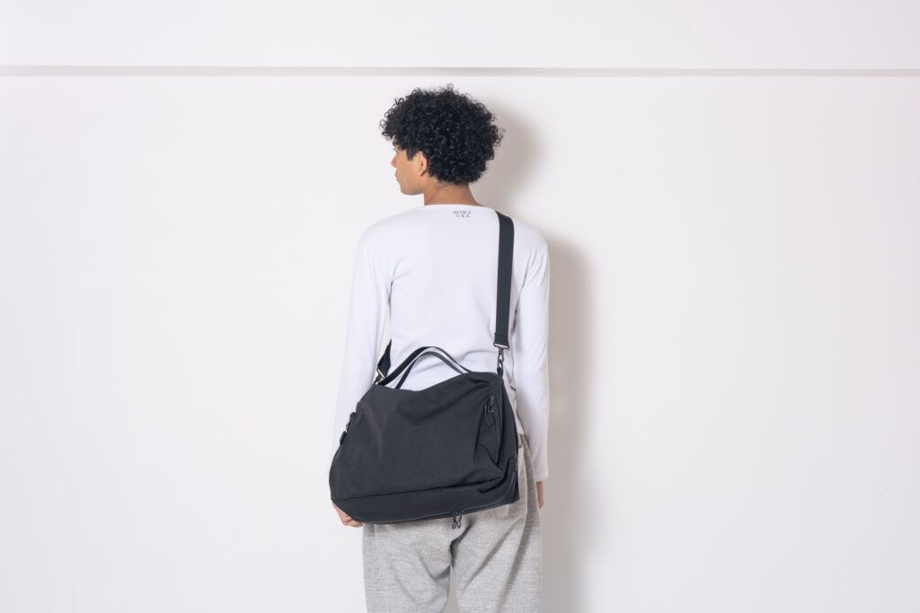 「モーフィングさせる」をテーマに完成させた「MORPH」シリーズ。 使い方でバッグのシルエットを変化させます。 天マチに備え付けた持ち手で荷物を持ち運べば、ドレープしながらAライン型に変化。底マチは大開口のファスナーポケットになっていて、そのままポケットとして使わずライニングを外に出して使用すれば、外装以上の収納力を上げることも可能です。 また、ポケットとして収納する場合は、水分を含んだ荷物を入れても、メインの部屋に水気が移らないようPVC加工されたライニング構造になっています。 本体生地は特殊な糸使いと加工の組み合わせで極限まで密度を上げて仕上げをしており、撥水性を高めたスエードのような風合いとタッチが魅力の超高密度Mil Clothです。イタリア陸軍で正式装備に採用されたこともあるタフな素材を使用。肉厚でしなやかな生地にフルベジタブルレザーをコンビネーションして完成させた高級感漂うボストンバッグとなっています。 MAIN ORGANIZERにはIpad13インチクラス(約300×200×25mm)が収納可能なクッション材入りポケットがあります。ポケット材料はPVC加工が施された生地で縫製され、水気と衝撃から守る構造となっています。